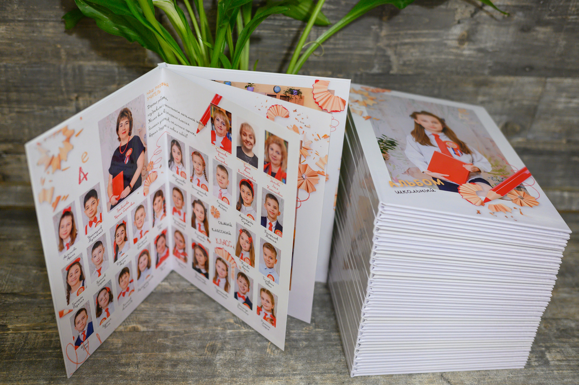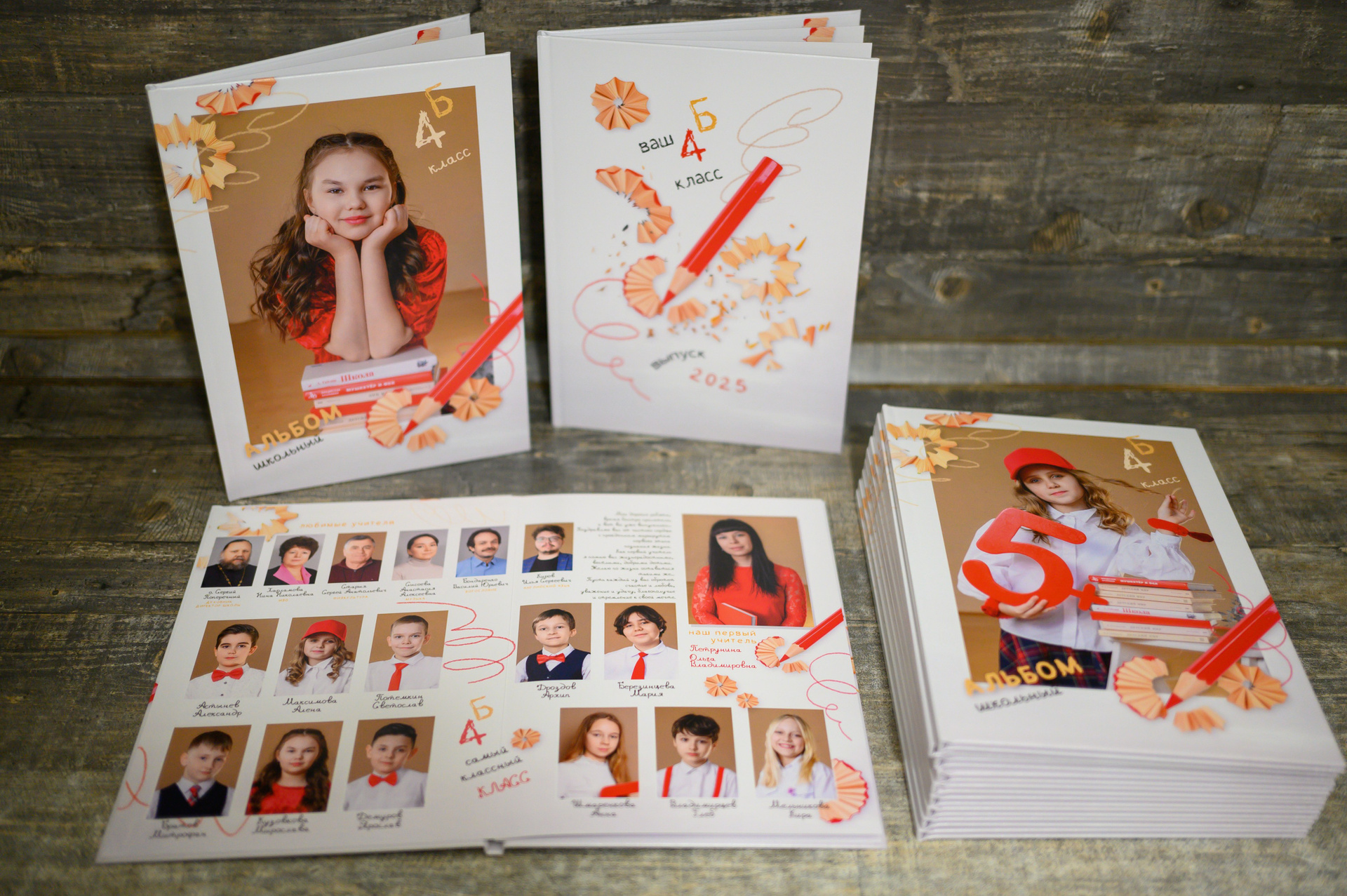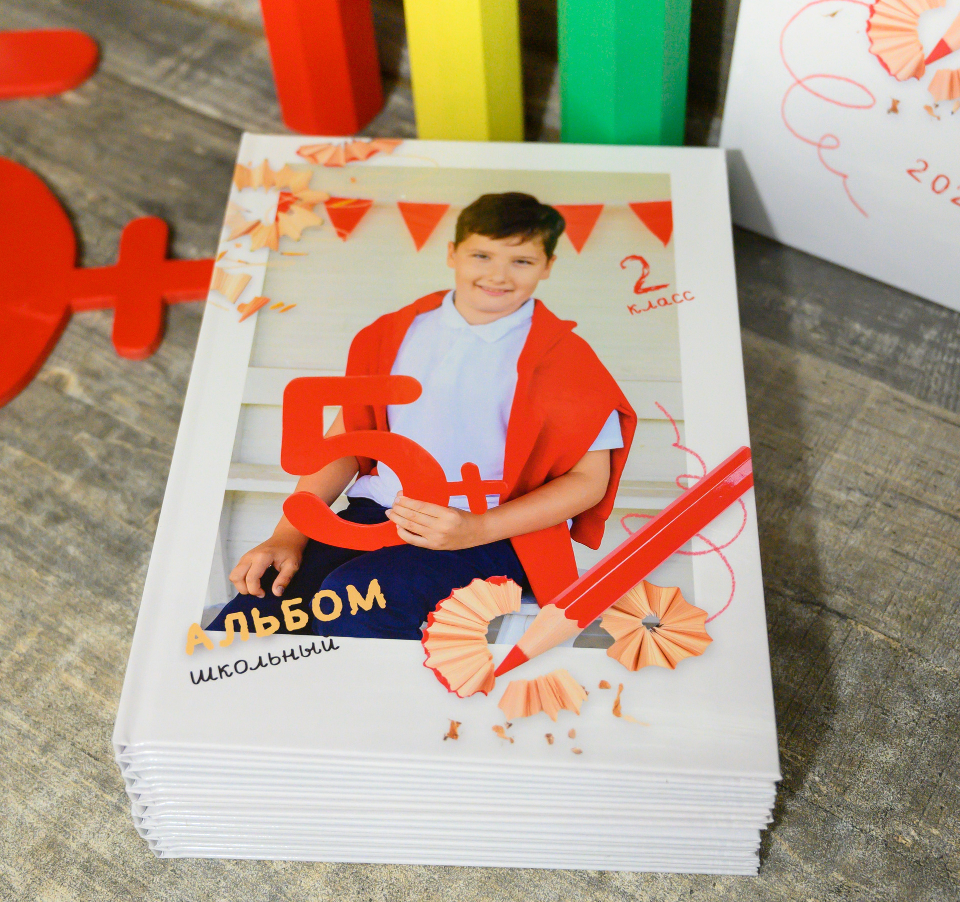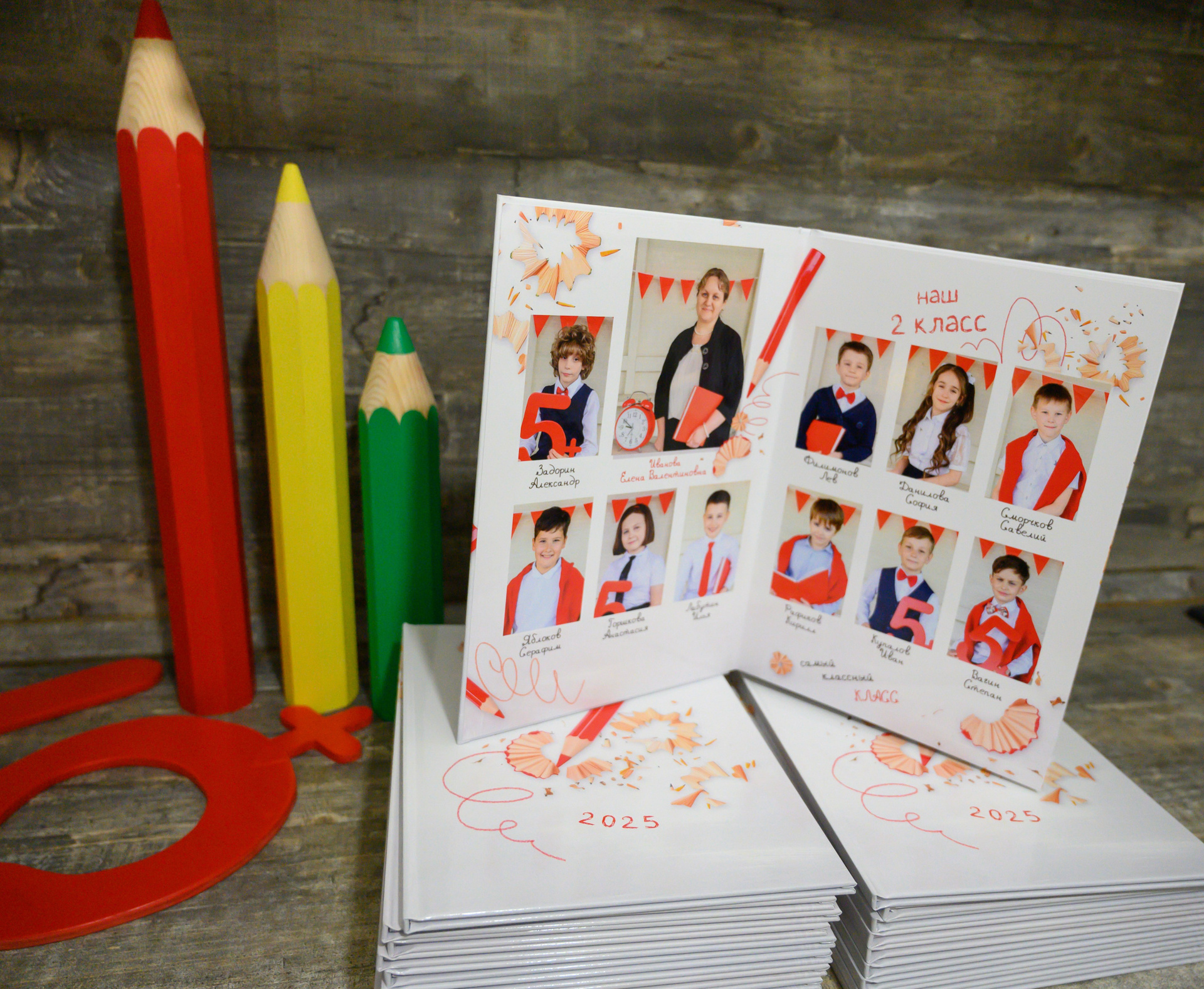Большой полиграфический альбом (24-40 страниц) с единой версткой для всего класса— все альбомы абсолютно одинаковые для всех.
