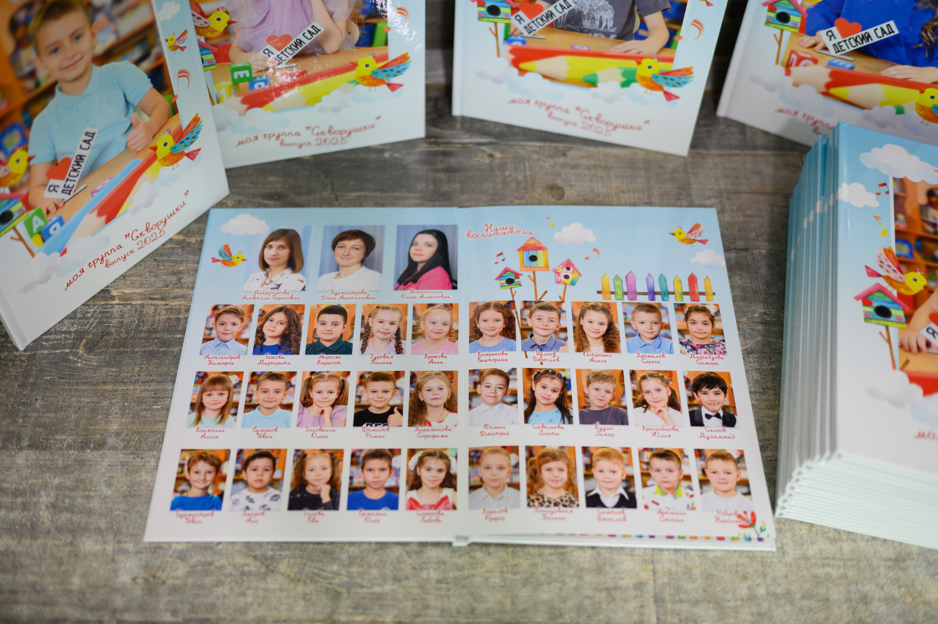 - разворот с виньеткой (портреты воспитателя и всех детей с ФИО)